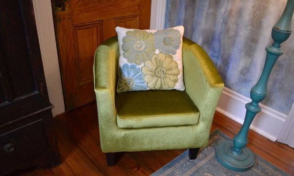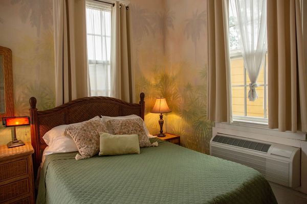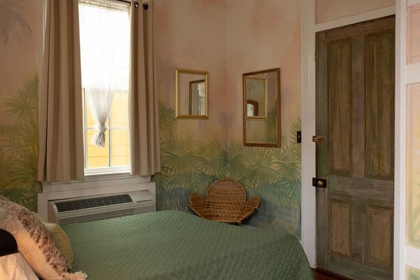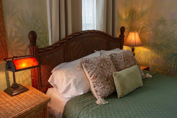 A sweet and private room, the walls are lovingly hand-painted to make you feel as if you were in a lush palmetto grove. This room glows beautifully in the early morning light, but drapes and venetian blinds may be closed to accommodate late sleepers.