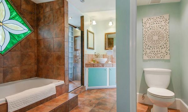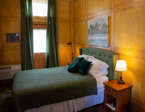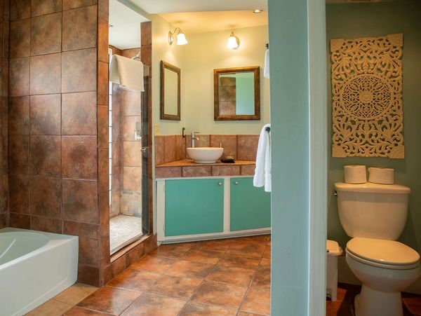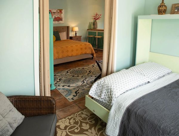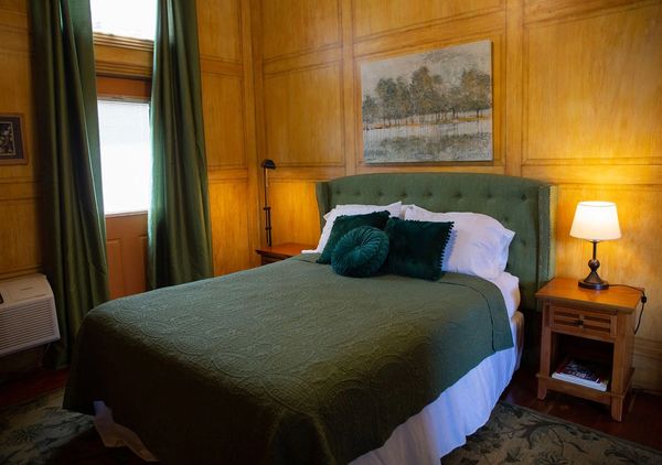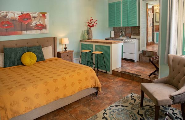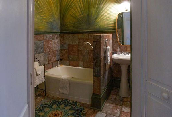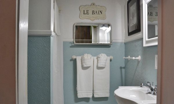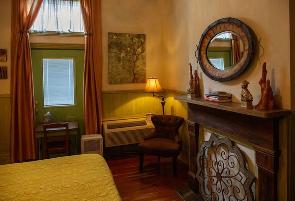The Courtyard Suite is essentially a studio apartment, and twice as large as our other rooms. It is also our honeymoon suite! This spacious and comfortable room features a king-sized bed, a pull-down, full-sized Murphy bed, kitchenette with stove, sink, and small refrigerator, oversized tub, walk-in shower, and a sitting area adjacent to the courtyard. Its secluded and quiet location at the back of the house makes it a perfect refuge for anyone seeking a little quiet personal time.