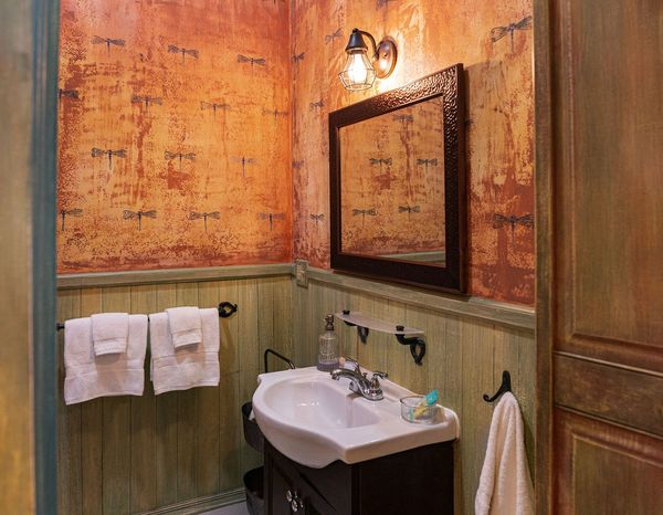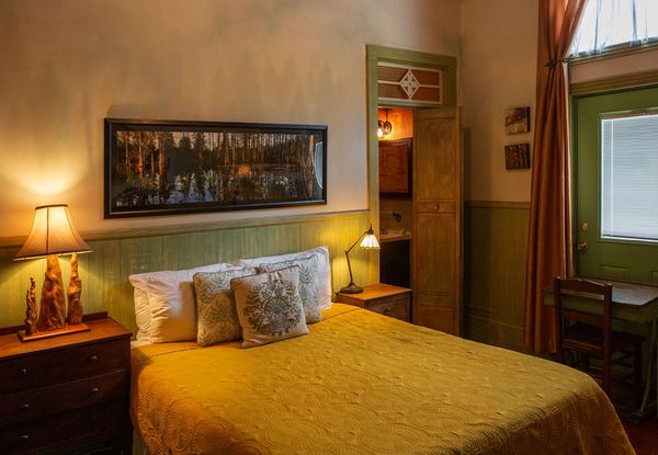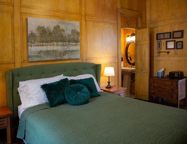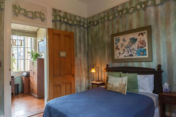 Glittering dragonfly stencils adorn the distressed terracotta finish of the private bathroom, which features a shower, toilet, and sink. A Queen-sized bed and large cedar wardrobe complete the furnishings. Quiet and shady, the Cypress Room offers guests a tranquil environment in which to rest.