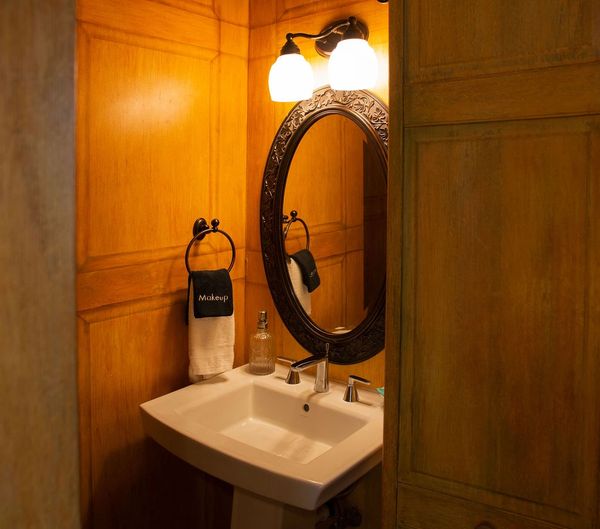 Lovingly hand-painted with a faux bois treatment throughout, this room features oak antiques. The bathroom includes a corner shower.