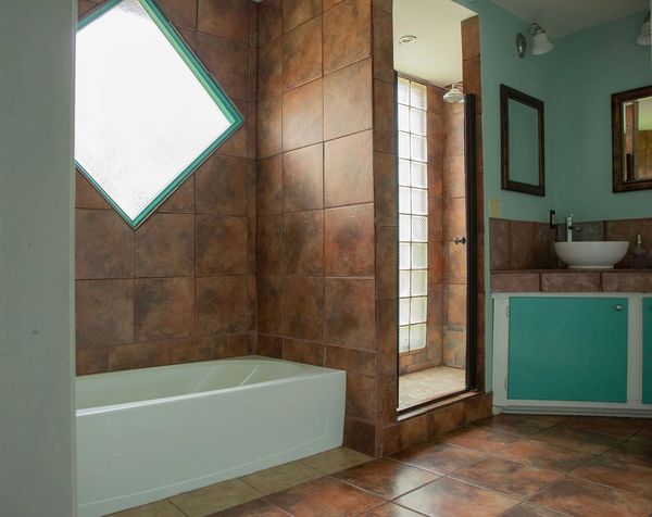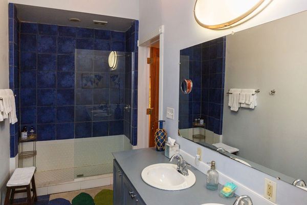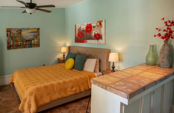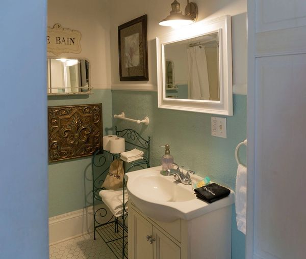 The bathroom is finished with crisp white tile. This room also features a romantic four poster King-sized bed set against the antique bricks and mantle of an original fireplace. A peaceful and inviting room, come and go as you please with your own private entrance. This is a lovely place for a couple to retreat after an exciting day in the Marigny and French Quarter.