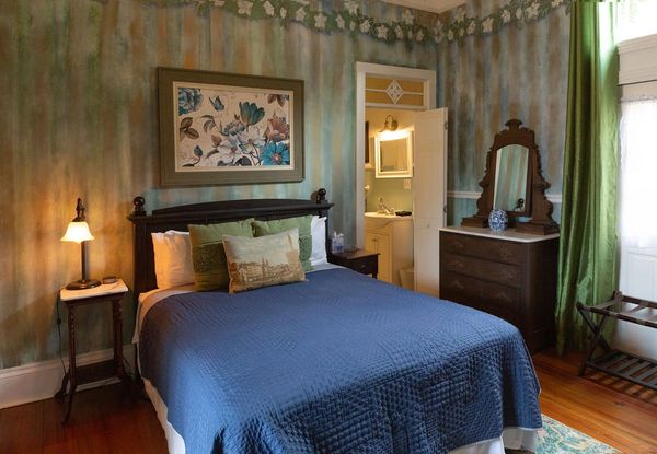 The Magnolia room's blue-green walls are adorned with magnolia blossoms; an antique marble dresser and grand mirrored armoire complete the furniture. The bathroom includes a standing shower.